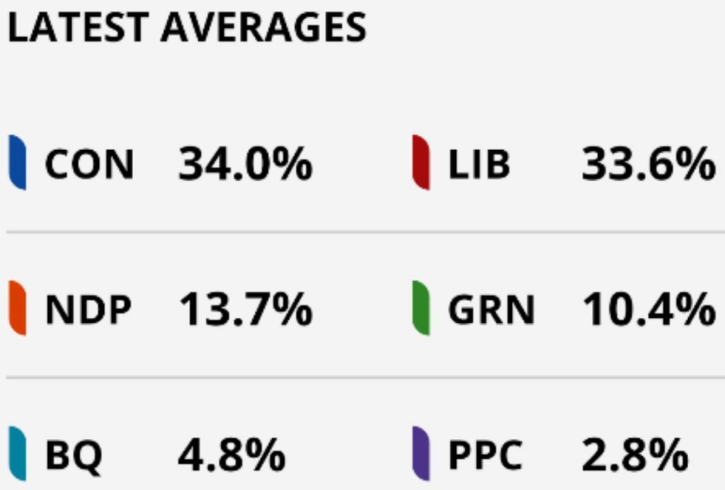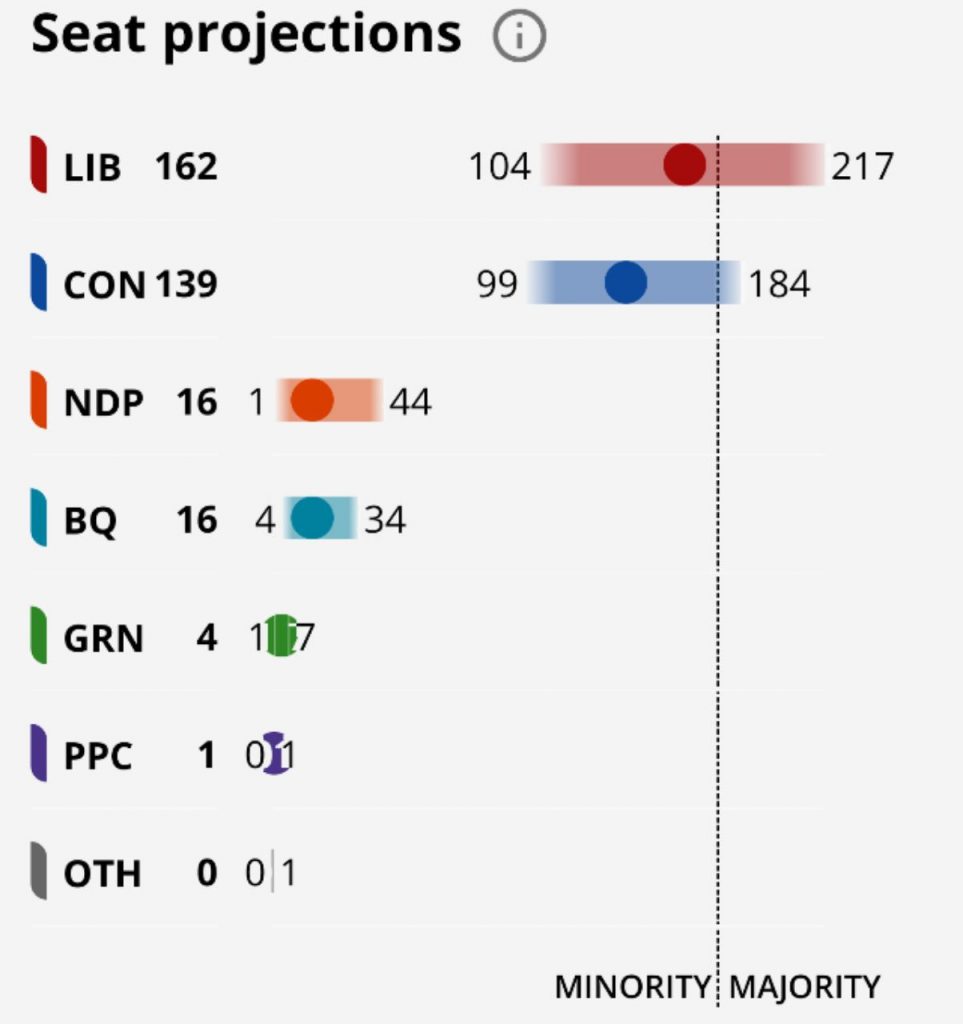 رقابت بین دو این حزب همچنان شانه‌به‌شانه است و تا اینجای کار به نظر نمی‌رسد هیچکدام از دو حزب لیبرال و محافظه‌کار موفق به تشکیل دولت حداکثری شوند و کانادایی‌ها احتمالأ باید خود را برای تشکیل دولت حداقلی آماده کنند. موضوعی که در سایه اختلافات عمیق این روزها در فضای چند قطبی سیاسی کانادا، آسان به نظر نمی‌رسد.