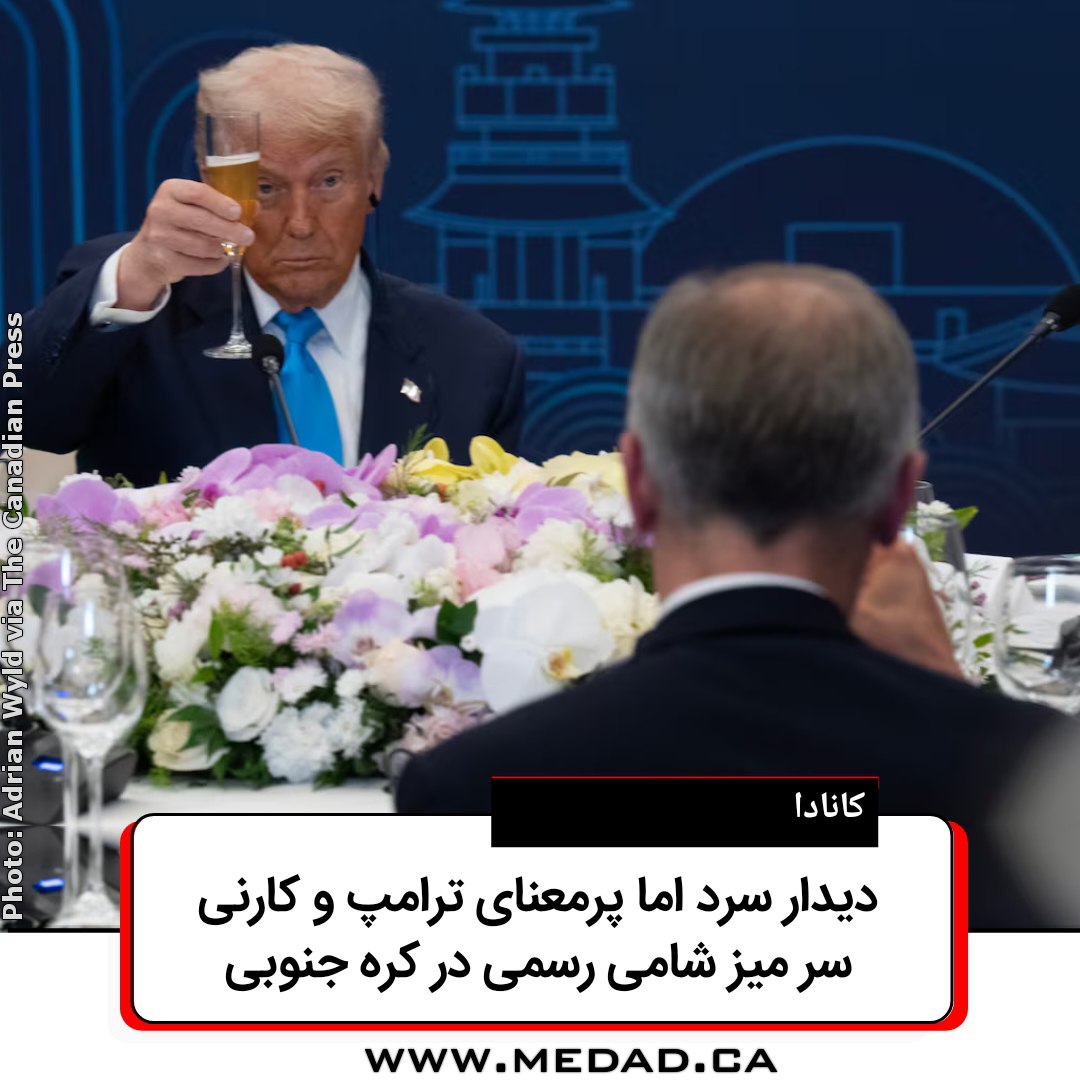 دونالد ترامپ و مارک کارنی شامگاه چهارشنبه در شهر گیونگجو کره جنوبی در ضیافتی رسمی که به میزبانی رئیسجمهور کرهجنوبی، لی جائهمیونگ برگزار شد، روبهروی یکدیگر نشستند. این نخستین حضور همزمان دو رهبر در یک اتاق پس از آن است که ترامپ هفته گذشته مذاکرات تجاری با کانادا را «پایانیافته» اعلام کرد.