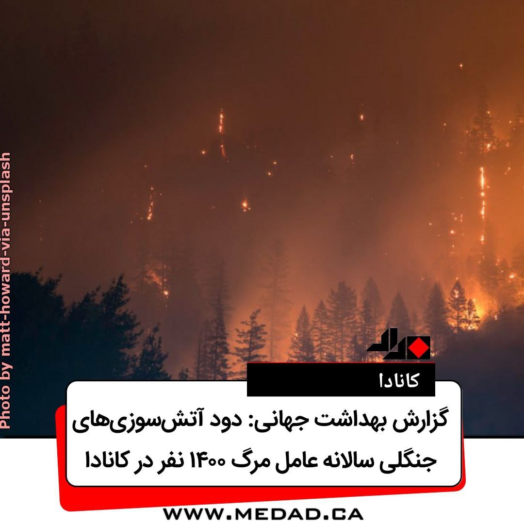 به گزارش CTV، گزارش جدید سازمان بهداشت جهانی درباره‌ی سلامت و تغییرات اقلیمی نشان می‌دهد هر سال در فاصله‌ی سال‌های ۲۰۲۰ تا ۲۰۲۴ حدود ۱۴۰۰ مورد مرگ در کانادا در اثر آلودگی ناشی از دود آتش‌سوزی‌های جنگلی ارتباط داشته است.