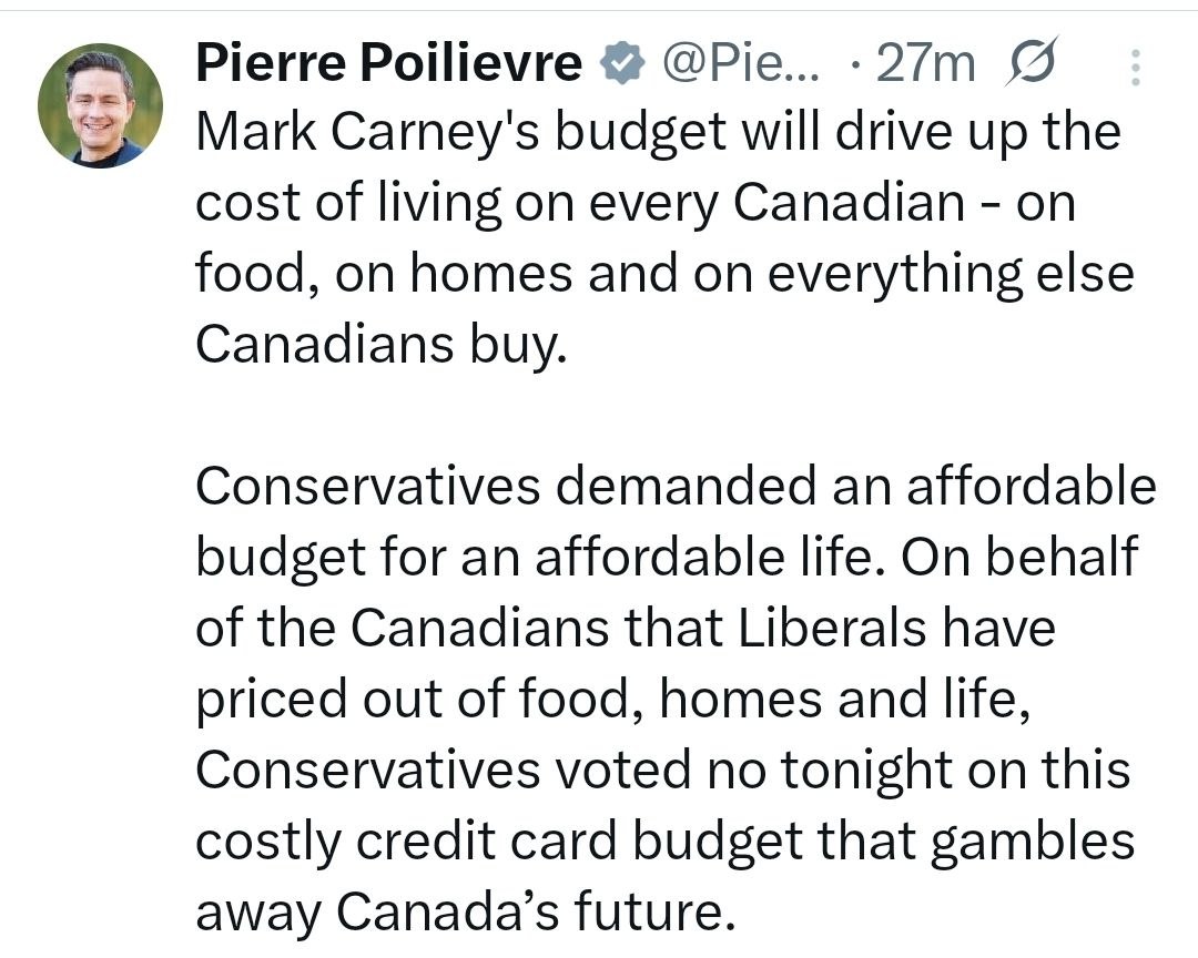پوآلیو بودجه‌ی کارنی را «بودجه‌ی کارت اعتباری» نامید و گفت این طرح کمکی به بحران هزینه‌های زندگی نمی‌کند و تأکید کرد: «نخست‌وزیر با این کسری بودجه‌ی پرهزینه، آینده‌ی ما را روی کارت اعتباری ملی به خطر می‌اندازد.»