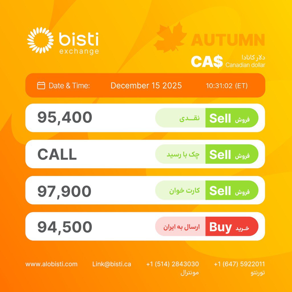 طبق اعلام صرافی بیستی، قیمت فروش و خرید دلار کانادا در بازار ارز مونترال به ترتیب حدود ۱۲۰ و ۱۱۶ هزار تومان اعلام شده است.