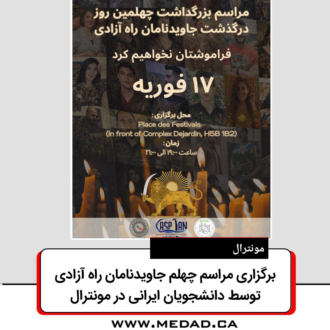 انجمنهای دانشجویان ایرانی دانشگاههای مونترال، شامل «کاسپین»، «ایساکو» و «میسا»، از برگزاری مراسم بزرگداشت چهلمین روز درگذشت جاویدنامان راه آزادی خبر دادند. این آیین یادبود فردا، سهشنبه، ۱۷ فوریه در میدان Place des Festivals و مقابل کمپلکس دژردن برگزار خواهد شد.