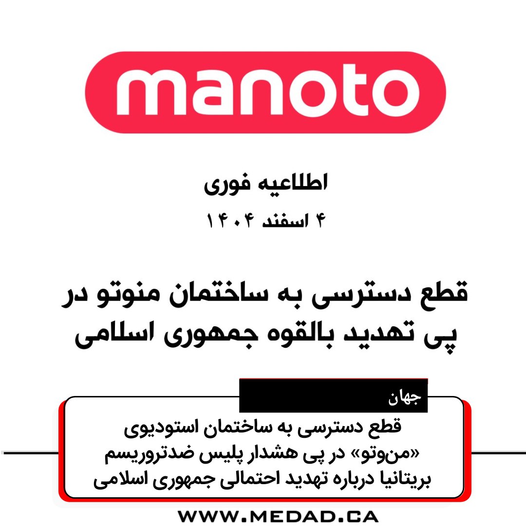 شبکهی تلویزیونی منوتو با انتشار اطلاعیهای فوری اعلام کرد که در پی دریافت هشدار از سوی پلیس ضدتروریسم بریتانیا دربارهی «تهدید بالقوه» منتسب به جمهوریاسلامی، دسترسی این شبکه به ساختمان محل استودیویش قطع شده است.